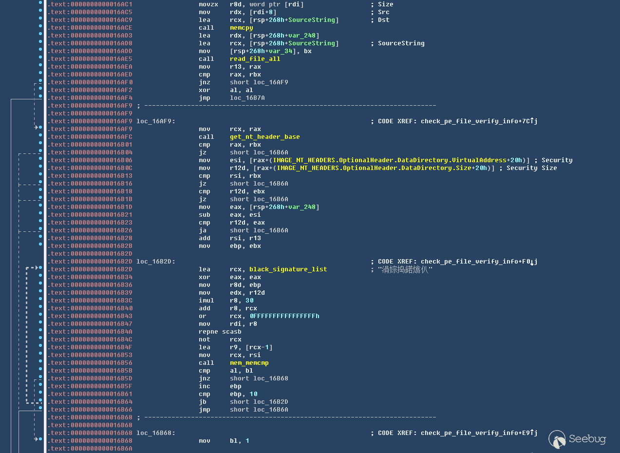 如上圖,除了主流安全軟件的簽名外,還包括有"上海域聯"的簽名信息。該簽名雖然已經過期,但是不會影響驅動正常加載,所以經常被病毒程序盜用,去年大面積爆發的"小馬激活病毒"也是盜用了"上海域聯"的簽名。相關代碼如下圖所示: