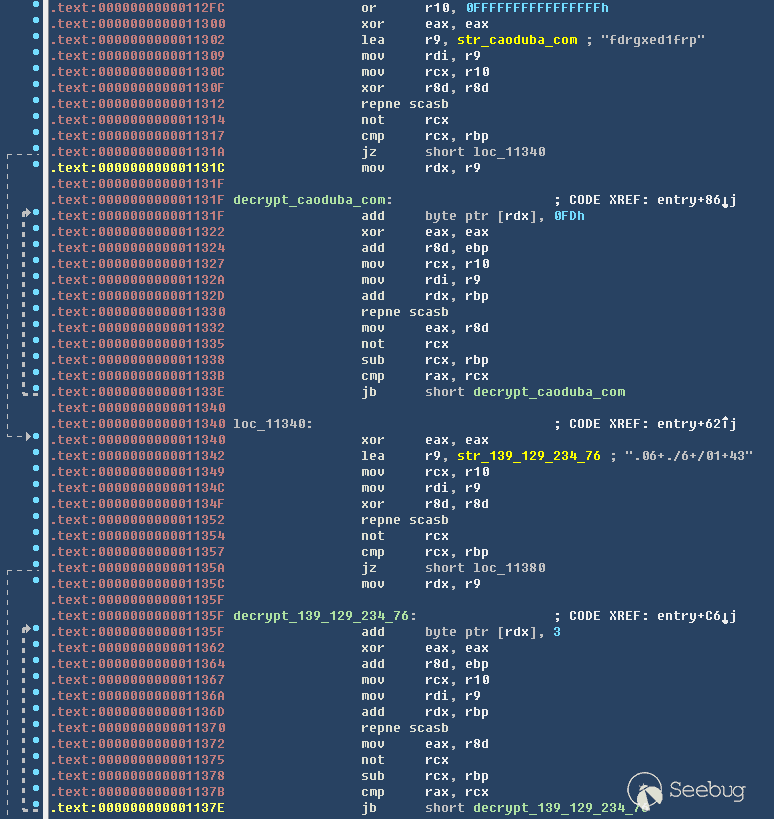 該病毒執行后,會不斷地與 C&C 服務器(域名:caoduba.com 或 139.129.234.76,通訊端口:7897)進行通訊。病毒使用的域名和 IP 地址解密代碼,如下圖所示: