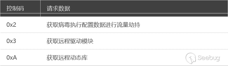服務器在獲取到病毒請求數據的通知后,可以根據控制碼返回被請求的數據。通過網絡通訊,病毒可以進行遠程驅動模塊加載、獲取遠程動態庫注入系統進程、獲取配置數據進行流量劫持。控制碼含義,如下圖所示:
