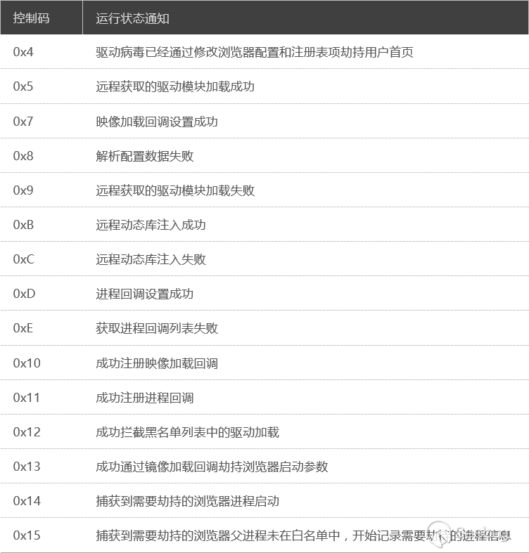 服務器可以根據通知中的控制碼獲取當前病毒的運行狀態,例如映像加載回調是否設置成功,是否已經成功劫持用戶主頁等,病毒作者可以根據這些通知得知病毒運行中可能存在的問題。控制碼含義,如下圖所示: