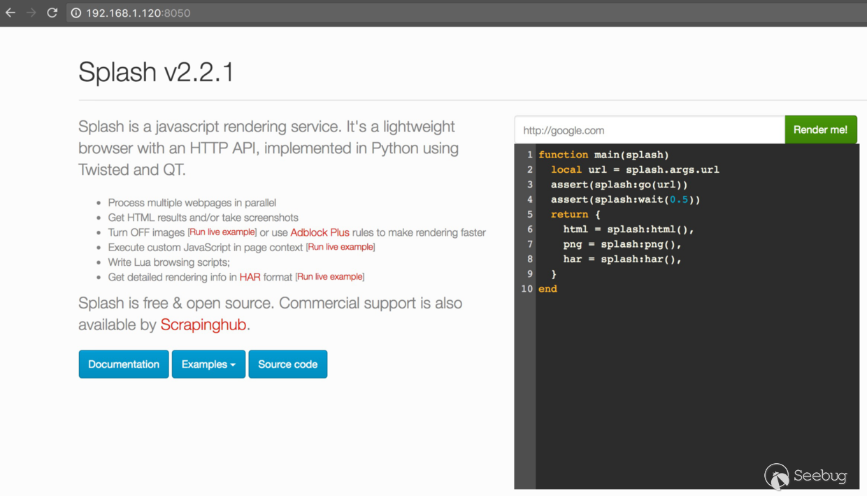 最近自己寫的小工具在掃描的過程,發現了某公司在公網開放了一個使用開源系統的站點,該系統為 Splash,是一個使用 Python3、Twisted 和 QT5 寫的 javascript rendering service,即提供了 HTTP API 的輕量級瀏覽器,默認監聽在 8050 (http) 和 5023 (telnet) 端口。