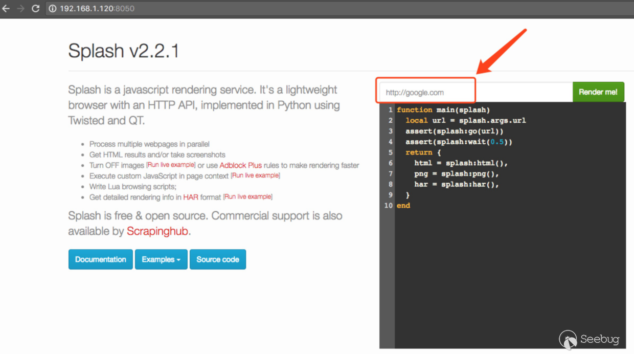 在宿主機上訪問 http://192.168.1.120:8050/ ,右上角有一個填寫 url 的地方,這里存在帶回顯的