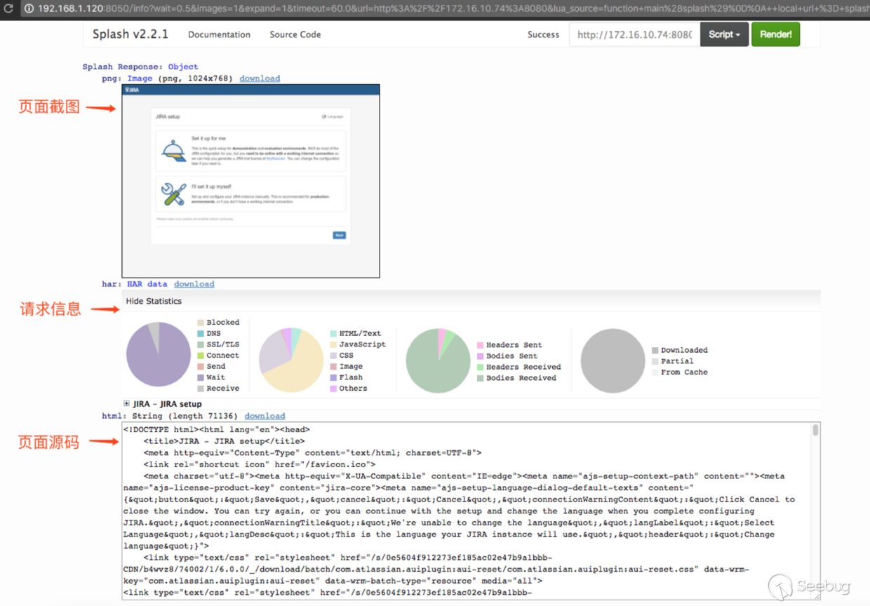 這里填寫內網 jira 的地址 http://172.16.10.74:8080 ,點擊 Render me!,可以看到返回了頁面截圖、請求信息和頁面源碼,相當于是一個內網瀏覽器!