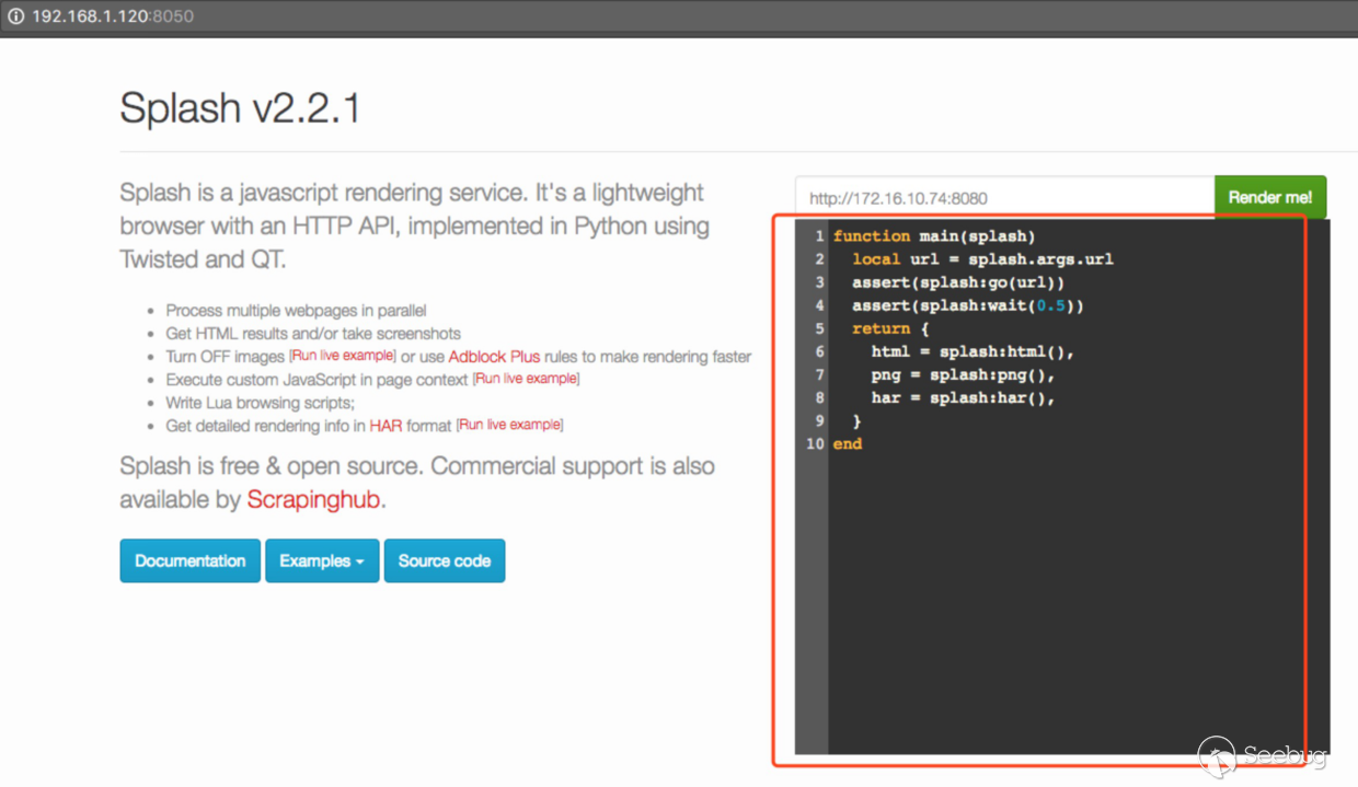 閱讀了下文檔,得知 splash 支持執行自定義的 Lua scripts,也就是首頁填寫url下面的部分