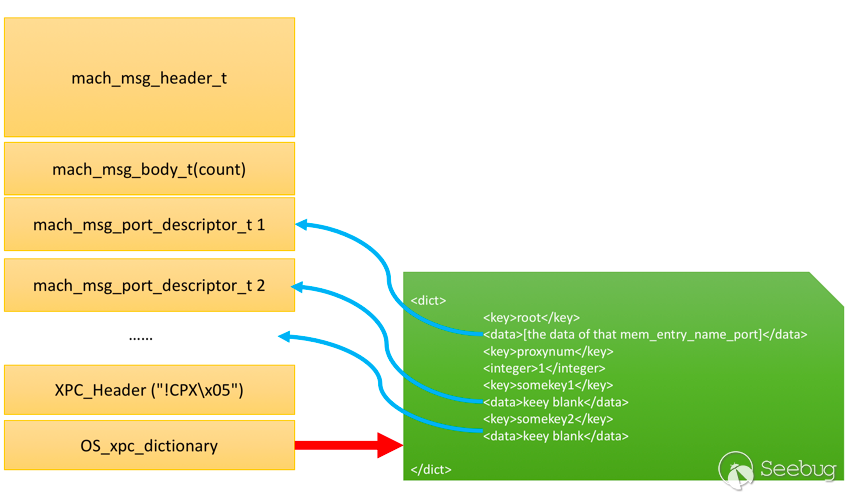 第一點 Ian Beer 是通過在發送的 XPC message 里加入了 200 個 “heap_sprayXXX” 的key,他們的
