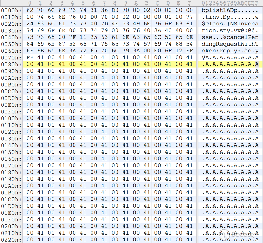 Ian Beer 構造的初始字符串是 @”mfz”AAAAA\x20\x40\x20\x20\x01\x00\x00\x00”\x00, 其中 mfz 字串是運行時隨機生成的3個隨機字母,這是為了避免 Foundation 對已經出現過的字符串進行 cache 而不分配新內存(因為利用需要多次觸發嘗試)。