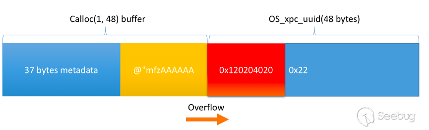 0x30 大小的 block 上噴一些 OS_xpc_uuid 對象,這樣當觸發漏洞 calloc(1,48) 的時候,讓分配的對象后面緊跟一個 OS_xpc_uuid 對象。