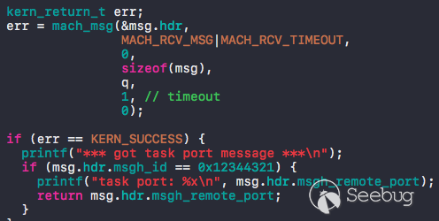 隨后,攻擊端會接收 machmsg,如果獲取到的 msgh_id 為 0x12344321 的消息,說明我們成果得到了目標進程的 task port: