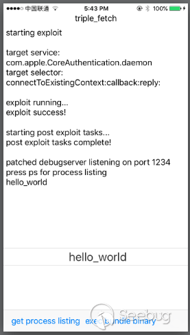 其實這個 exp 不但可以執行 debugserver,還可以用來在沙盒外執行任意的二進制文件。只要把 pocs 文件夾下的 hello_world 二進制文件替換成你自己的想要執行的二進制文件,編譯安裝后,點擊 ui 中的 exec bundle binary 即可: