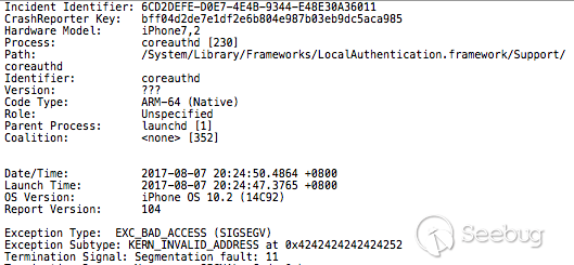 攻擊所選擇的 NSXPC 服務是 “com.apple.CoreAuthentication.daemon”。對應的二進制文件是 /System/Library/Frameworks/LocalAuthentication.framework/Support/coreauthd。原因是這個進程是 root 權限并且可以調用 processor_set_tasks() API 從而獲取系統其他進程的 send right。下圖是控制了pc后的crash report:
