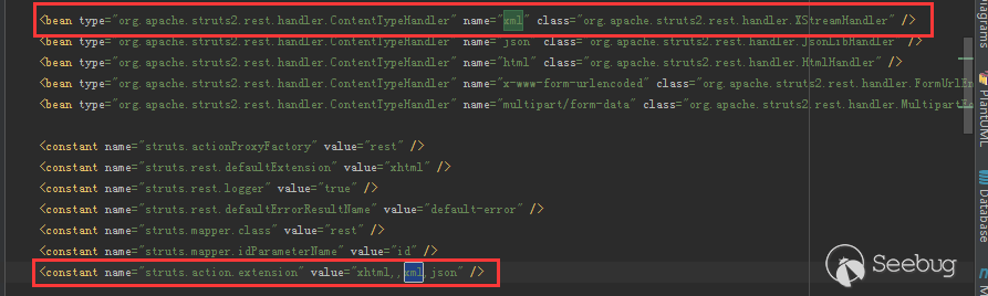 從這個文件中就可以看出 XStreamHanler 就是Content-Type:xml的默認處理句柄,而且可以看出xml是默認支持格式,這也就是說存在rest插件就會存在XStream的反序列化漏洞。