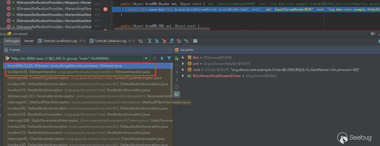 在 XStreamHanler.toObject 調用了 XStream 的 fromXml,從而進入反序列化流程。