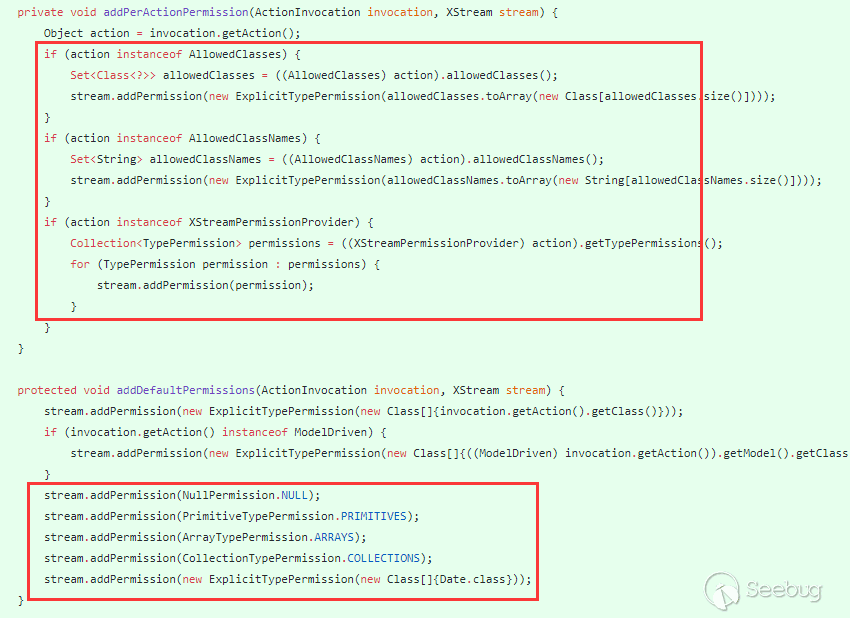 在官方的修復方案中,主要就是將 xml 中的數據白名單化,把 Collection 和 Map,一些基礎類,時間類放在白名單中,這樣就能阻止 XStream 反序列化的過程中帶入一些有害類。