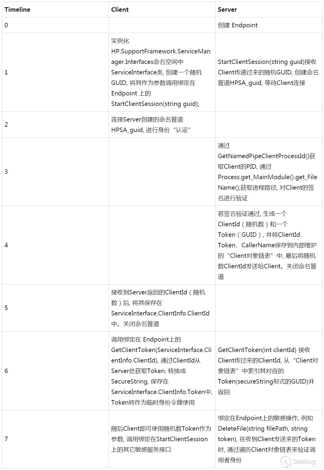 HPSA 在連接建立時對 Client 進行了認證,以阻止敏感接口被惡意程序調用。Server 與 Client 的交互過程如下表所示: