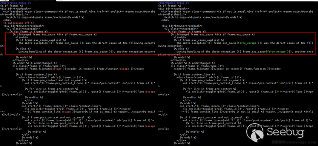 如果要觸發這兩個輸出點,就必須進入這個 if 語句:{% ifchanged frame.exc_cause %}{% if frame.exc_cause %}。