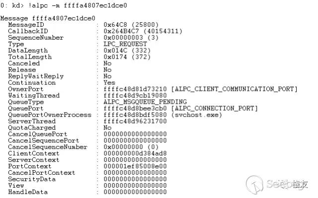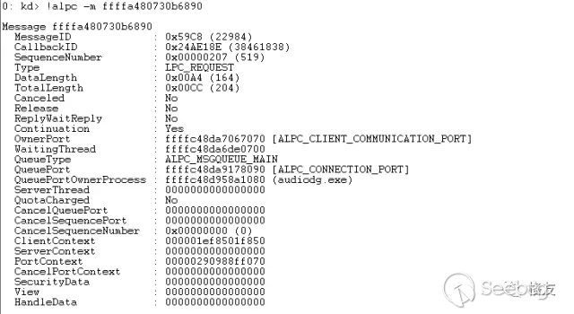 讓人高興的是WinDBG給出了豐富的細節。使用!alpc -m顯示消息詳情: