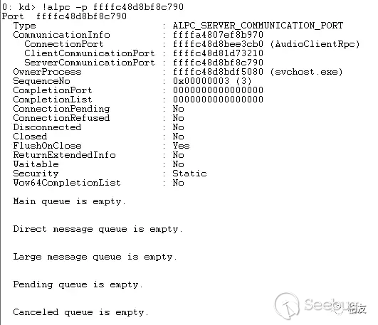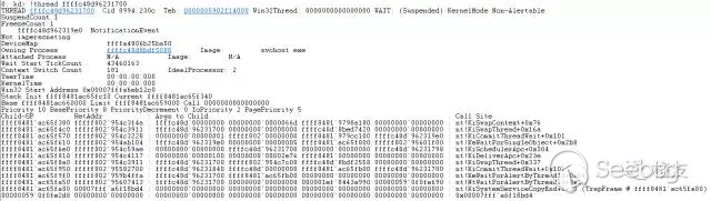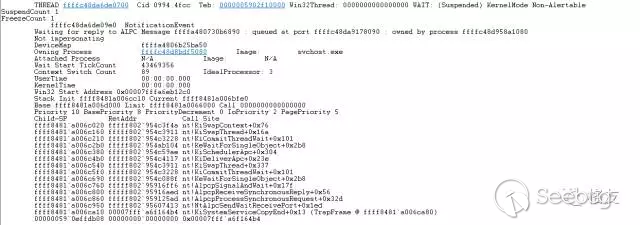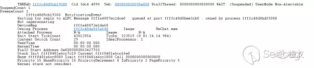 從線程的基本信息中,果然看到它在等待ALPC消息(RPC在本機時經常使用的通信方式)。