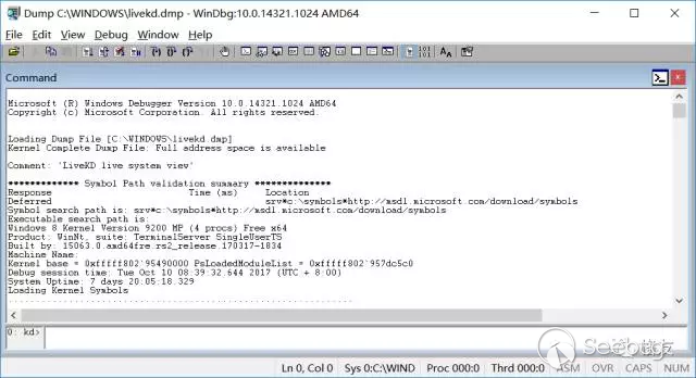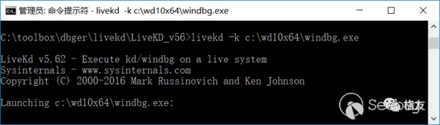躊躇之間,忽然想到了 MarkR 的 livekd,啟動一個管理員權限的控制臺,切換到 livekd 目錄,發出命令:livekd -k c:\wd10x64\windbg.exe