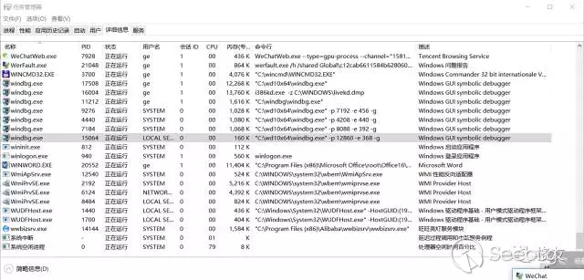 思考片刻,有了推測,或許是它崩潰了,觸發了JIT調試。打開任務管理器觀察,果然如此,在會話0里有 windbg 附加在它身上了。還有另外幾個 WinDBG 實例,看來后臺服務崩潰了好幾個,分別是 vmms、DELL 預裝的 DDV 服務、以及windows自動更新服務。(這么多的崩潰或許與前幾天的 Windows 10 自動升級有關,留待以后討論。)