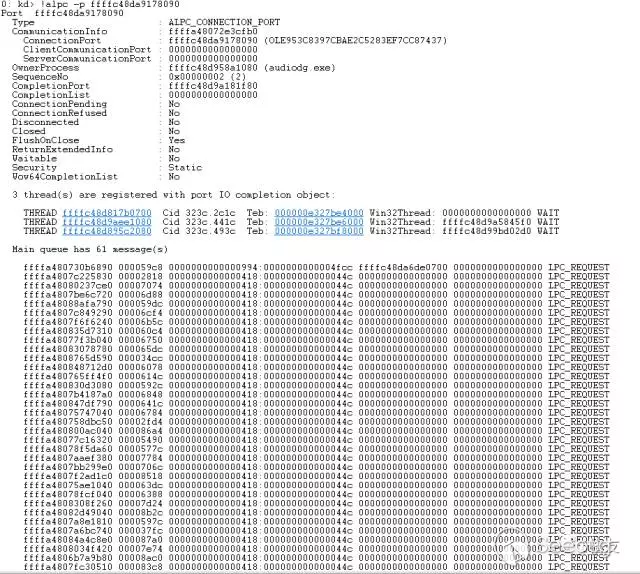 注意上面顯示的信息中 ServerThread 條目為空。不過,這并不代表沒有服務線程,觀察服務端口(QueuePort),可以看到有三個線程登記注冊了完成端口(線程間快速協作機制,名字翻譯為中文后有點不通,姑且不論),記下它們的線程ID,分別是2c1c、441c和493c。