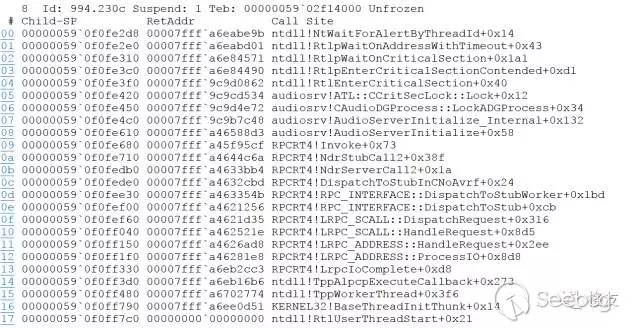 再開啟一個 WinDBG 實例,附加到 svchost 進程(進程ID 994)。~* k列出所有線程的執行軌跡,找到230c號線程(RPC服務線程)。