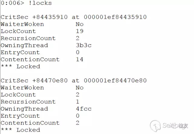 WinDBG 告訴我們有兩個臨界區處于鎖狀態。因為臨界區是不可以跨進程的,所以可以確定剛才的230c線程一定在等待其中的一個。哪一個呢?