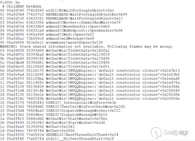 waveXXX 系列 API 是 Windows 平臺上經典的多媒體編程接口,用來輸出和輸入聲音,從函數名中的 waveIn 看便知道它是用來接收聲音(錄音)的。如此看來,微信程序的UI線程是在打開錄音設備時遇到了障礙,并且卡住不能動了。