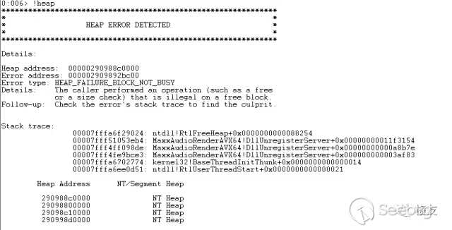 如此看來,追到源頭了。可以很負責任的說,音頻驅動模塊 MaxxAudioRenderAVX64 內部多次釋放堆塊,引發堆的錯誤檢查機制發起異常,MaxxAudioRenderAVX64 模塊應負全部責任。