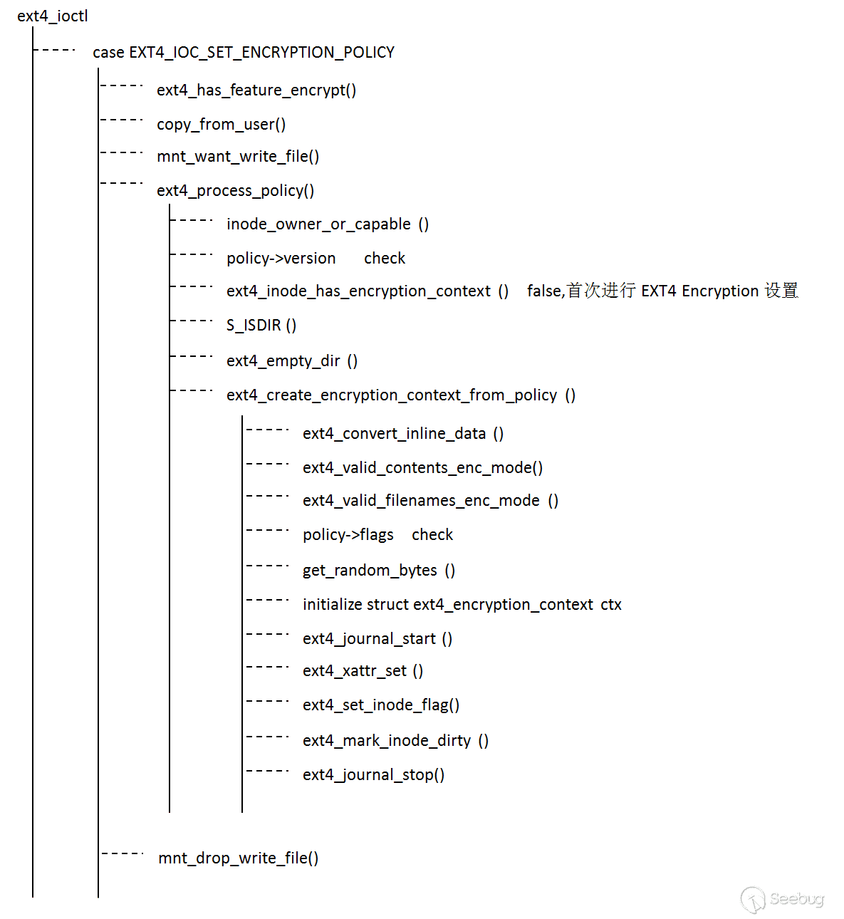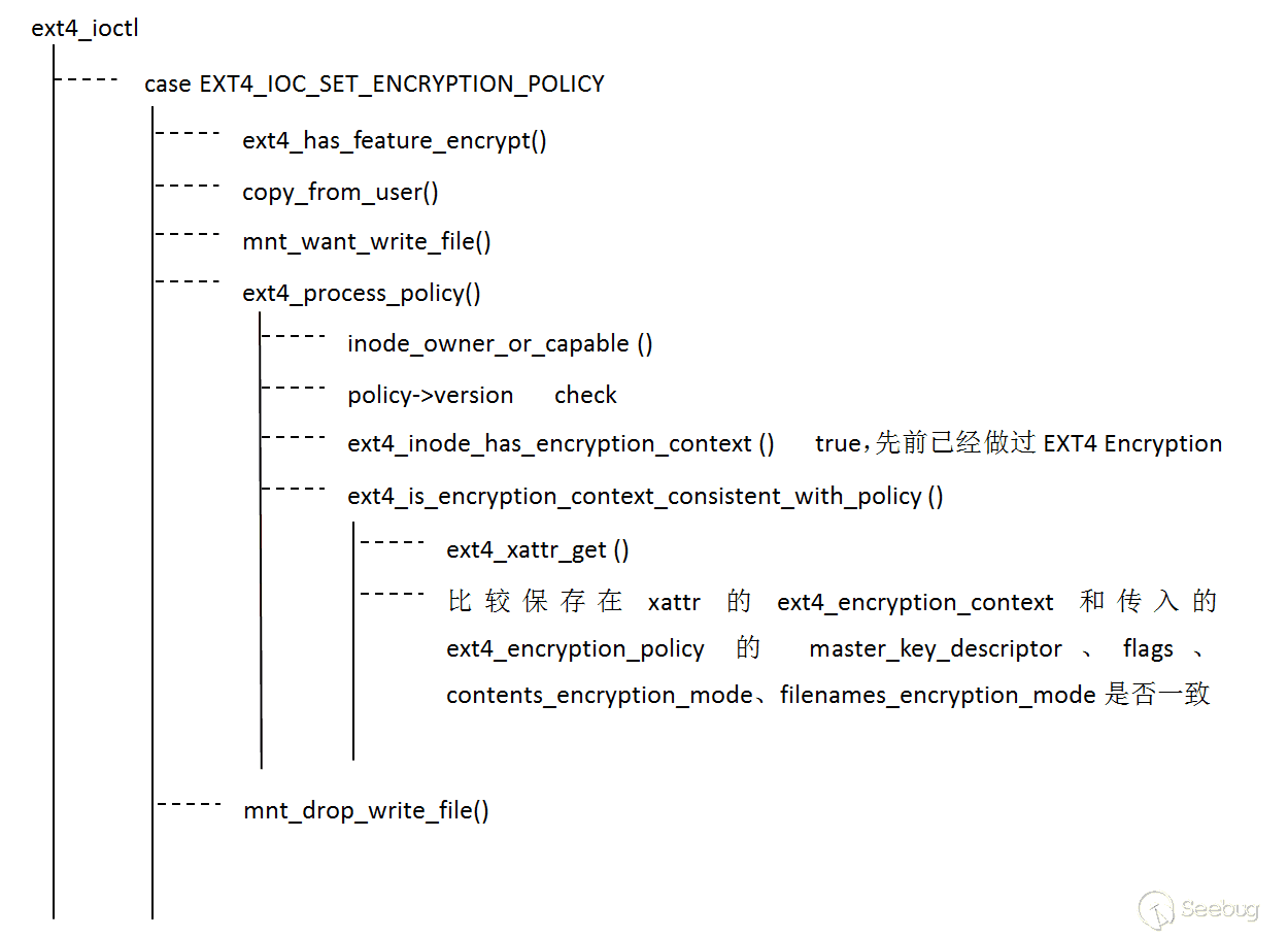 設置 EXT4 Encryption 開啟是通過對特定目錄進行EXT4_IOC_SET_ENCRYPTION ioctl完成,具體策略使用清單三所示的struct ext4_encryption_policy 數據結構進行封裝,包括版本號、文件內容的加密算法、文件名的加密算法、旗標、master key descriptor。每個加密文件保存的ext4_encryption_context信息均繼承自該數據結構,子目錄繼承父目錄的ext4_encryption_context。