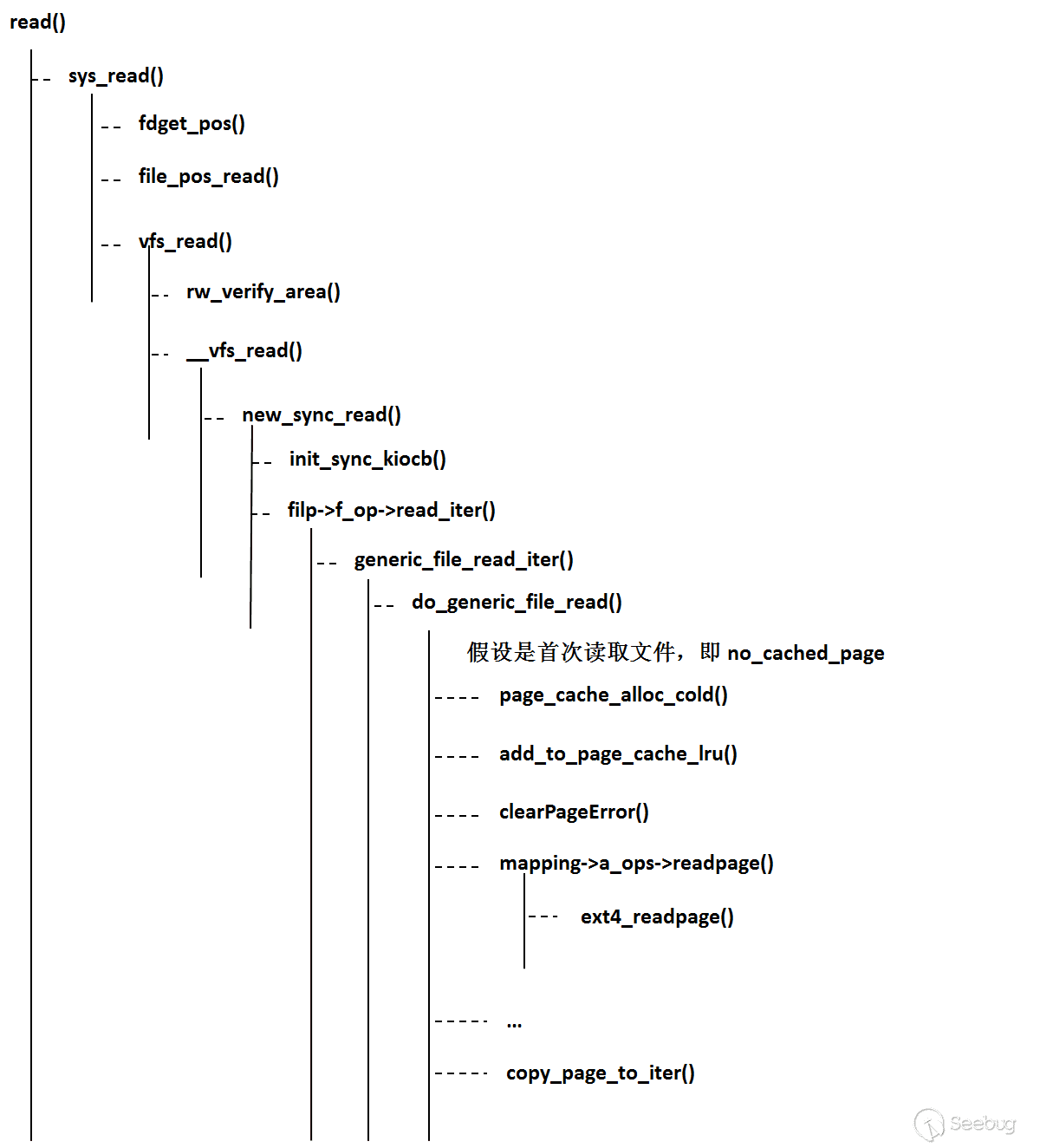 加密文件的解密工作主要是在 read 的時候進行。正常的 Linux read 支持 Buffered I/O 和 Direct I/O 兩種模式,Buffered I/O利用內核的 page cache 機制,而 Direct I/O 需要應用程序自身準備和處理cache,當前版本的 EXT4 Encryption 不支持Direct I/O,其文件內容解密工作都在 page cache 中完成。自應用程序發起 read 操作到 kernel 對文件內容進行解密的函數調用關系如圖八所示。