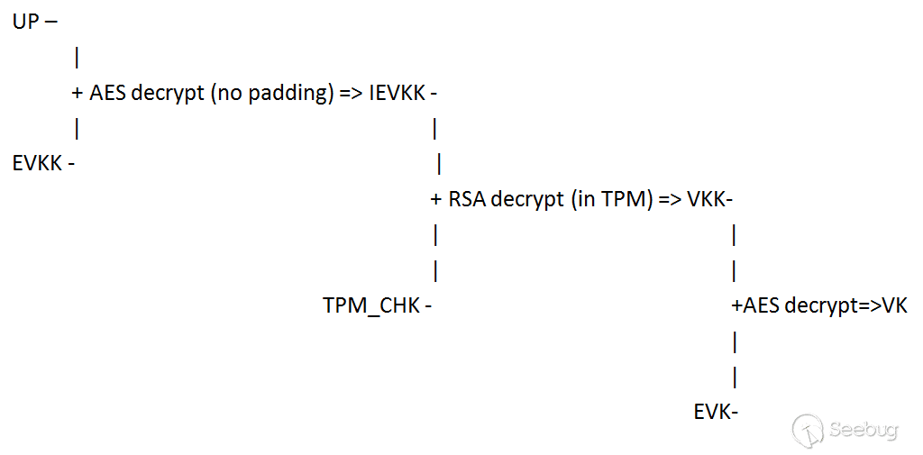 圖二中的UP(由發起mount的D-Bus請求中通過key參數傳入)做為一個AES key用于解密EVKK,解密后得到的IEVKK;然后將IEVKK做為RSA的密文送入TPM,使用TPM_CHK做為密鑰進行解密,解密后得到VKK;最后生成的VKK是一個AES key,用于解密master.0里的EVK,得到包含有FEK和FNEK明文的VK。經過三層解密,終于拿到關鍵的FEK,此FEK在Dircrypto模式下當做master key使用,FEK signature即做master key descriptor使用。