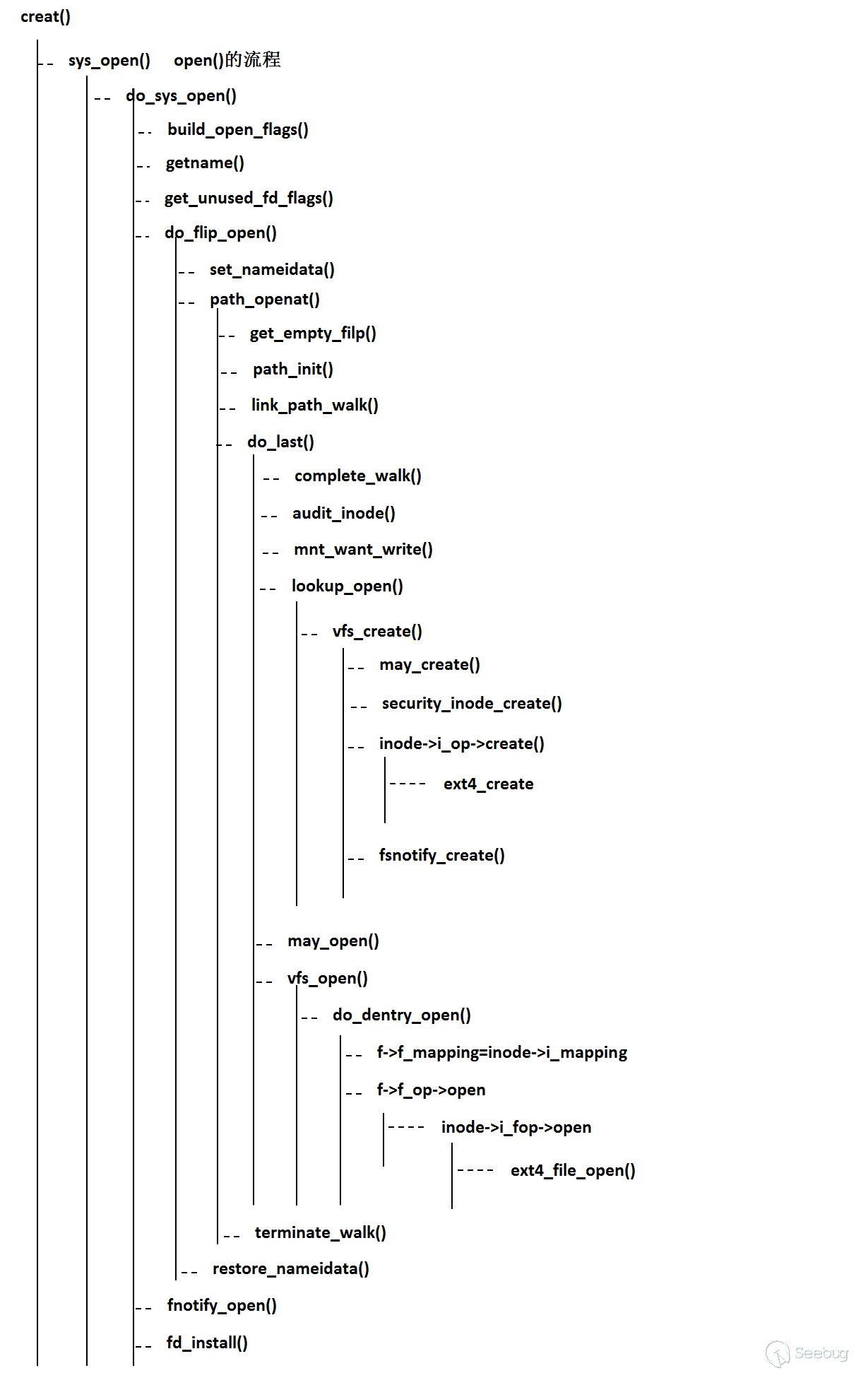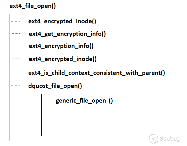 這里 open file 特指打開已存在的 EXT4 Encryption 加密文件。僅加密部分而言,該過程相比 creat 少了創建ext4_encryption_context保存到文件的 xattr 的操作,其余部分基本一致。從應用程序調用open()函數開始到最終調用到ext4_file_open()函數的函數調用關系如上圖五所示。本節主要描述ext4_file_open()函數,其函數調用關系如圖七。