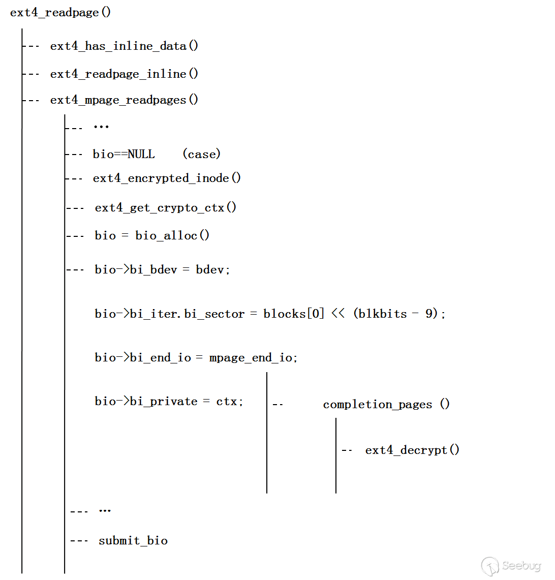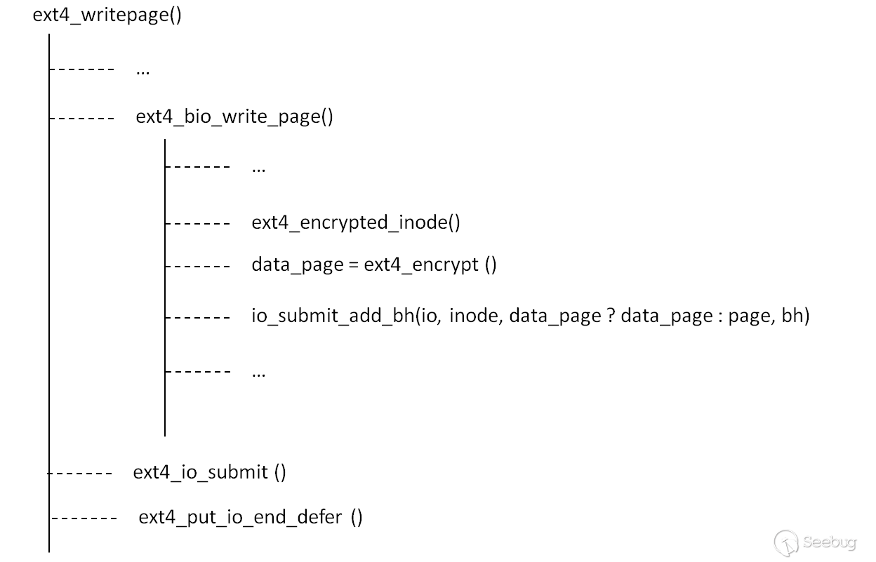 在寫入文件的時候會首先將 page cache 中的文件明文內容進行 AES-256-XTS 加密,再通過bio寫入磁盤,該工作主要在ext4_writepage()函數中完成,這里主要關注 EXT4 Encryption 部分,其函數調用關系如圖十所示。