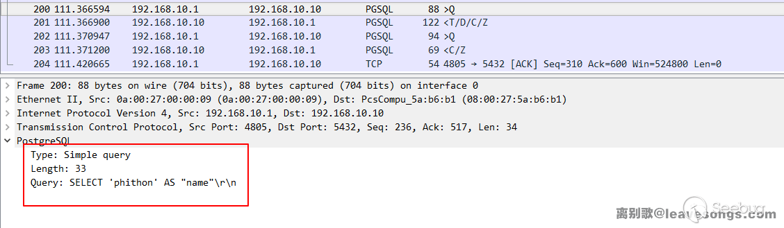 我們可以抓包試一下,關閉服務端 SSL,執行SELECT 'phithon' AS "name",可見客戶端發送的報文頭是Simple Query,內容就是我執行的這條 SQL 語句: