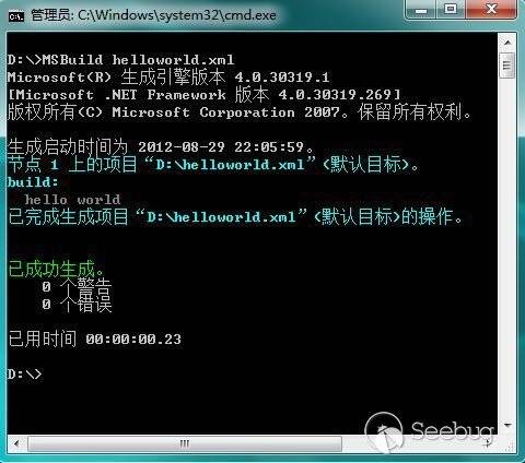 用MSBuild加載處理這個helloworld.xml項目文件,我們看到Message任務被執行,輸出了“hello world”。