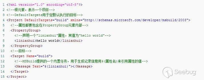 按照微軟的定義,XML架構的項目文件中可能包含屬性、項、任務、目標幾個元素,其中的任務元素中可以包含一些常見的操作,比如復制文件或創建目錄,甚至編譯執行寫入其中的C#源代碼。如下是一個XML項目文件的例子: