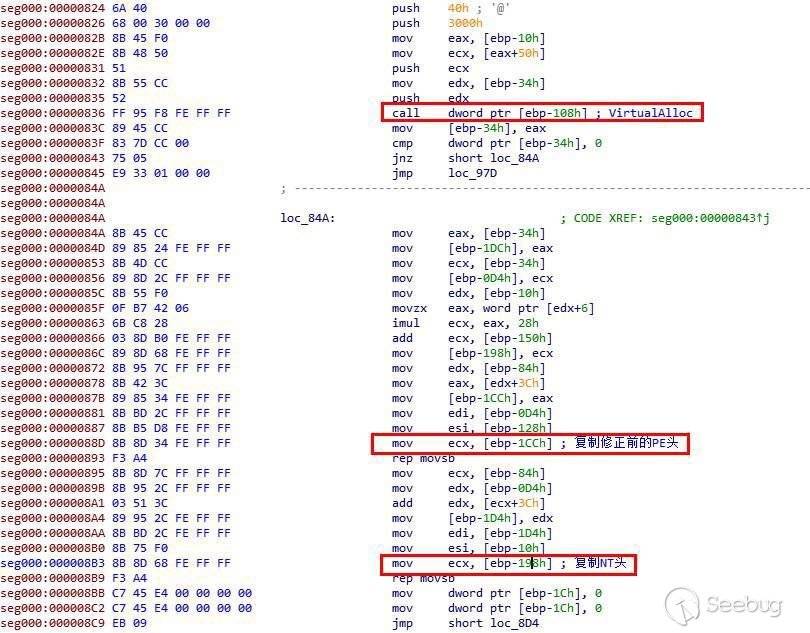 接下來會調用VirtualAlloc申請一片可執行的內存,并把后面附帶的PE文件分別復制到該內存中: