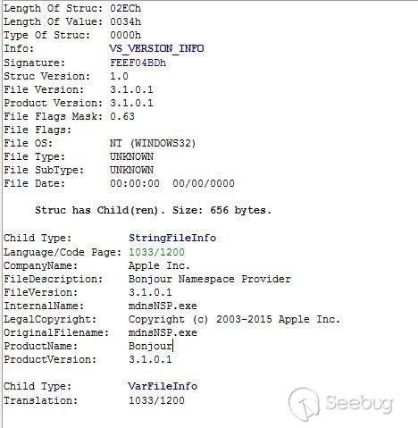 把此2處修改后,恢復正常PE的結構,可以查看PE的基本信息如下,版本信息偽裝來自蘋果公司: