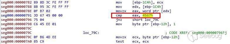 獲取系統調用地址完成后,Shellcode先判斷所附加數據的前2個字節是否為0x4567來確認是否為自己構造的文件,如果是則繼續執行: