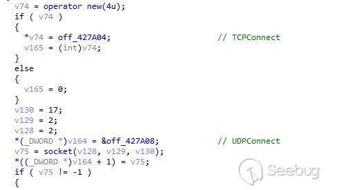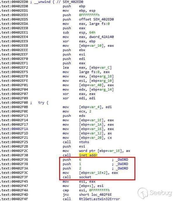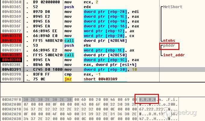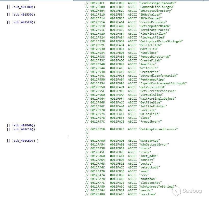 該文件是一個EXE程序,功能為支持DNSTunnel通信的遠控Server。程序中的字符串都做了簡單的加密處理,下圖為入口處初始化用到的API的地址: