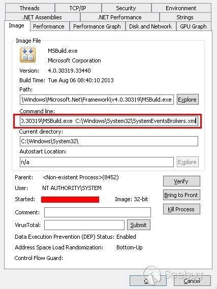 樣本的初始執行從MSBuild.exe開始,攻擊者把惡意代碼的Payload放到XML項目文件中,調用MSBuild來Build和執行,下圖為調用MSBuild程序的命令行屬性: