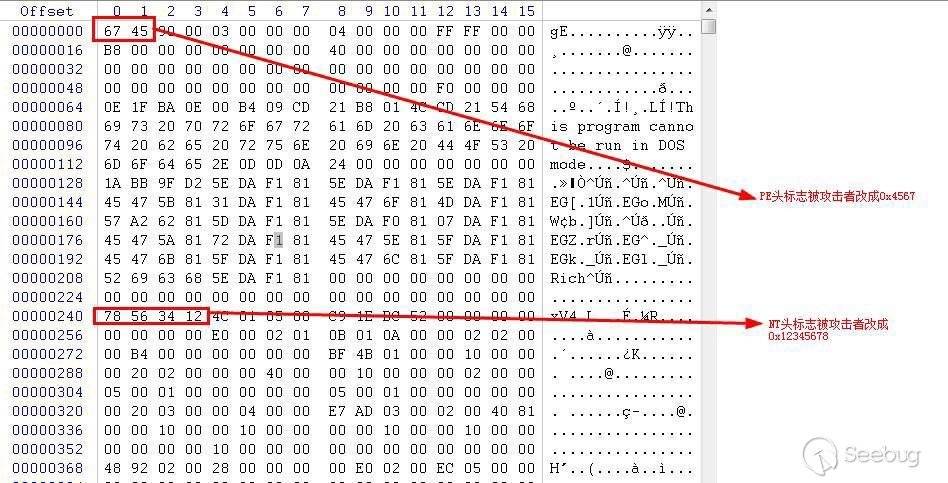 將此PE文件提取出來,我們發現文件的PE頭和NT頭的標志被故意修改了,PE頭被改為0x4567,NT頭被改為0x12345678,如圖: