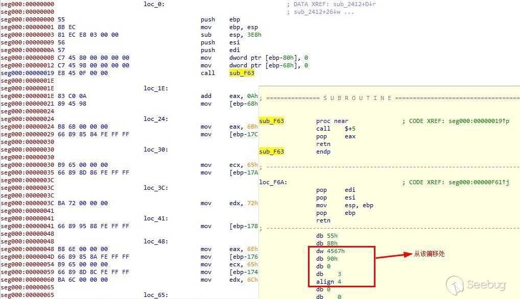 該腳本的功能主要是把var_code的數據經過Base64解密后在內存中執行,var_code解密后其實為一段shellcode。首先它會通過call/pop指令序列獲取到后面所附加數據的地址,數據起始在0xf63+0x0a處,頭部的前兩個字節為0x4567,地址存在ebp-0x68中,如下圖: